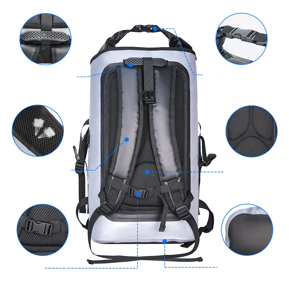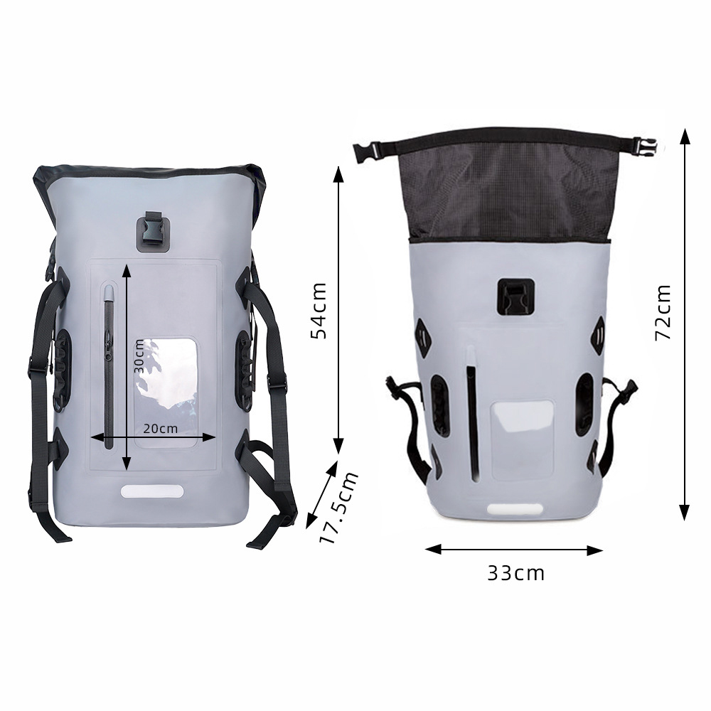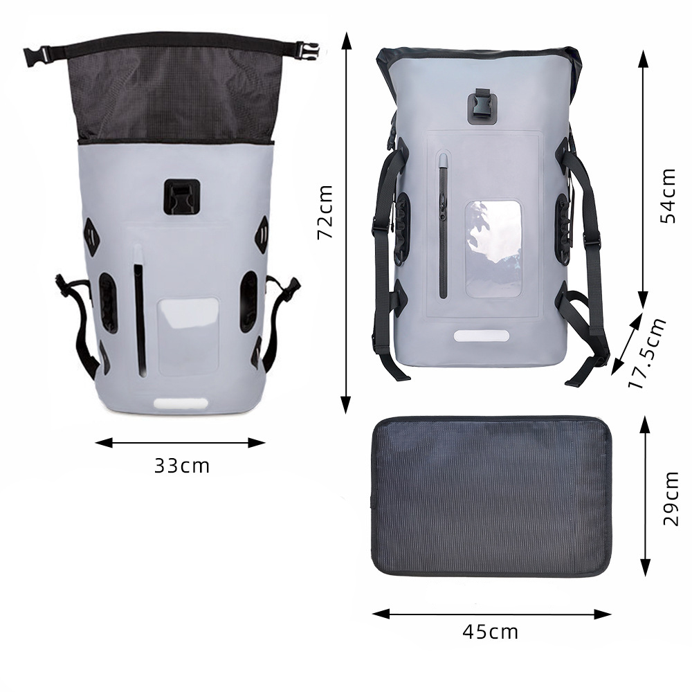 This fully waterproof outdoor backpack is made of thickened TPU waterproof fabric with high-frequency heat-sealing technology. The roll-top closure design achieves IPX7 waterproof rating, keeping your electronic devices and clothes dry even in immersion or heavy rain.