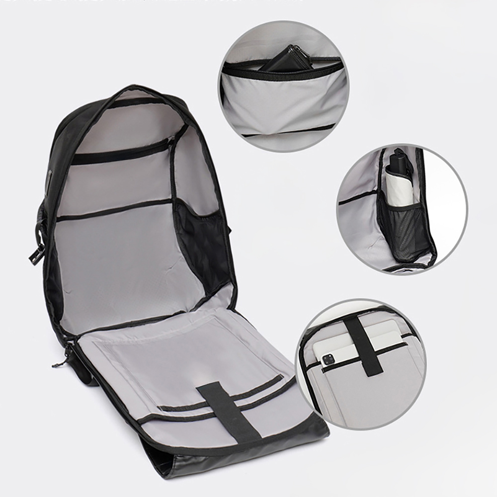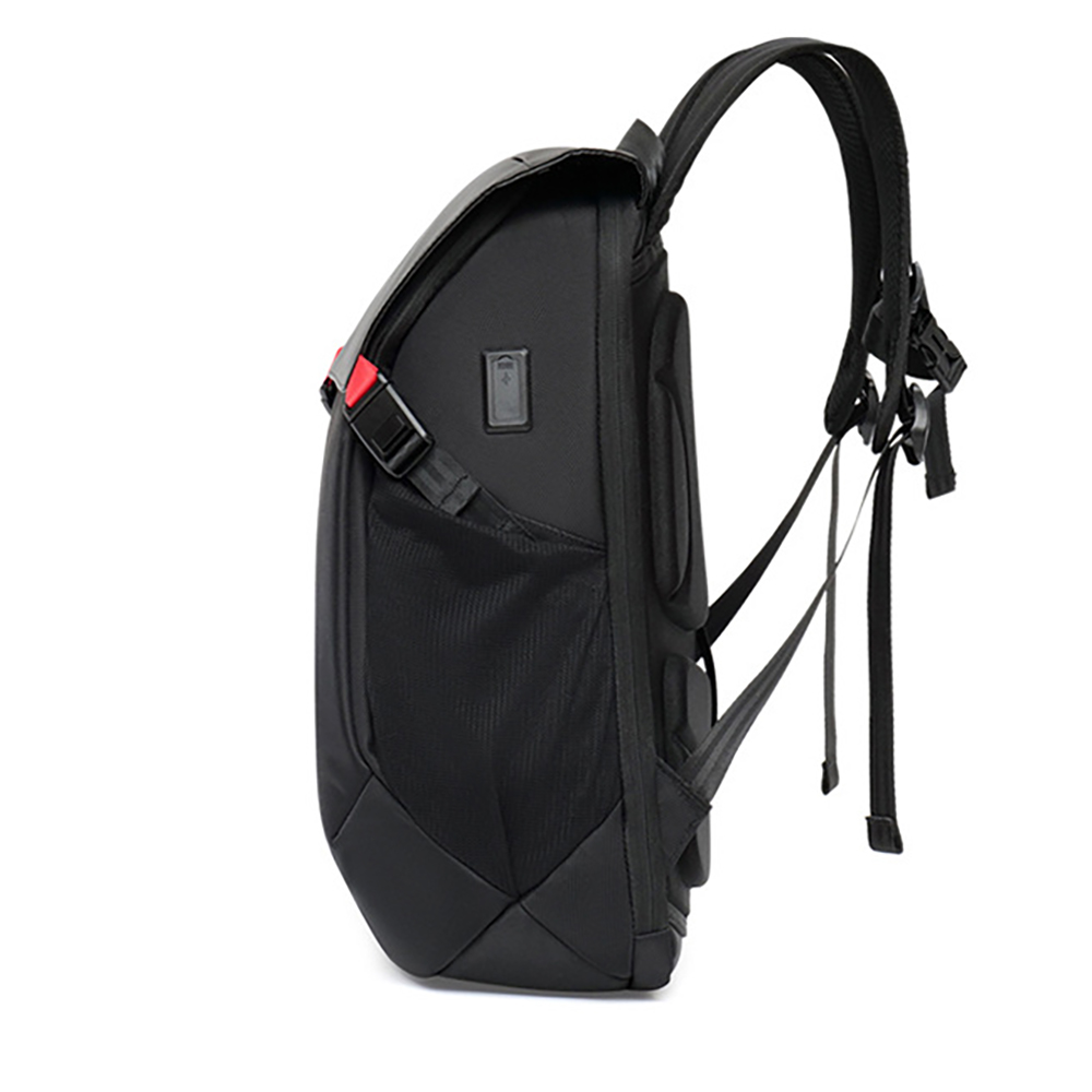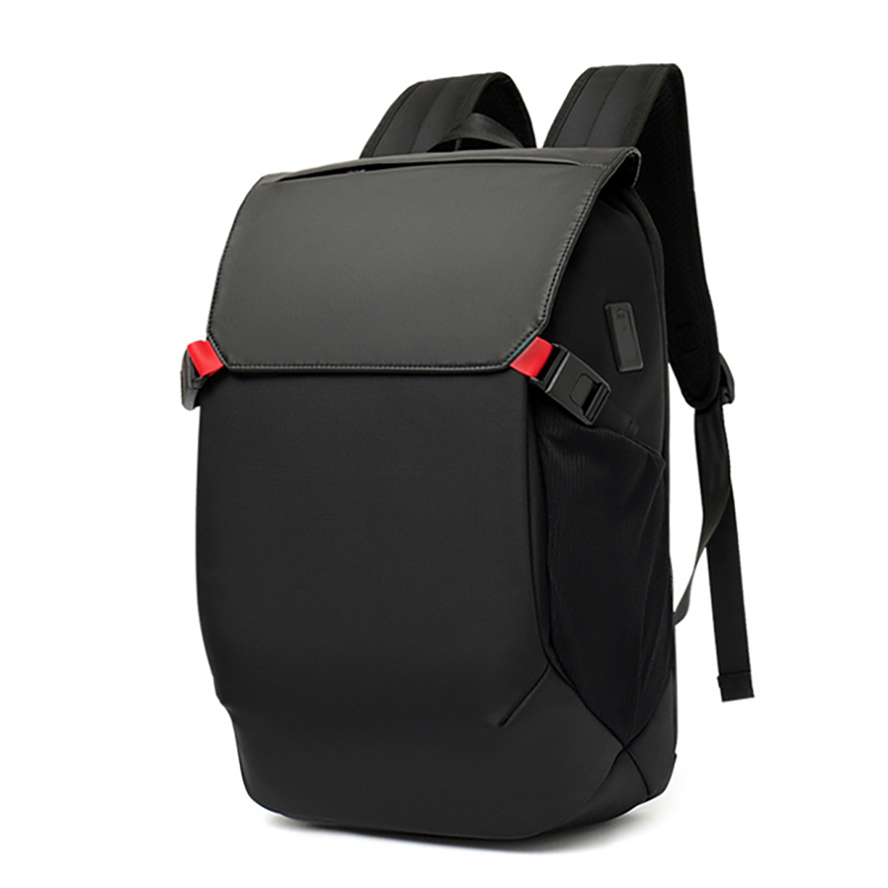 The main body of the bag is made of high-elasticity wear-resistant waterproof nylon cloth and matte PU spliced material, which has excellent tear and scratch resistance, waterproof and easy to clean. It can easily cope with complex environments such as rainy days and commuting dust, protecting internal items from moisture. The main compartment is spacious, and the interior adopts a multi-layer partition storage design. It is equipped with a thickened shockproof computer compartment that can stably hold a 15.6-inch laptop. Paired with an elastic fixing strap, it prevents device shaking and effectively buffers collisions; it is equipped with multi-specification pockets, including a file pocket, pen holder, card slot, tablet storage area and hidden pocket. It can orderly store keyboards, books, notebooks, power banks, documents and other personal items, making storage more organized and efficient.The outside of the bag is equipped with an external USB charging port, which can charge devices on the go by connecting to a power bank stored inside, completely solving the battery life anxiety during travel. The cover is equipped with red buckle lock designs on both sides, which can close the flip cover to prevent items from falling and increase anti-theft attributes. Elastic mesh pockets on the sides can flexibly hold water cups, folding umbrellas and other items. The back adopts an ergonomic decompression 背负 system, with a three-dimensional breathable sponge back panel and thickened widened shoulder straps, which can effectively disperse shoulder and back pressure, without stuffiness or shoulder pressure even when worn for a long time; the reinforced top handle supports both hand-held and shoulder-back carrying methods, with flexible switching.