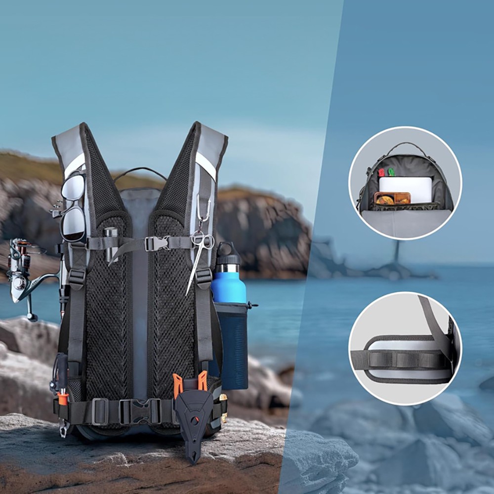 3.Adjustable Breathable Carry System: The padded, honeycomb mesh back panel, combined with adjustable chest and waist straps, creates a stable three-point carry system that effectively distributes weight, preventing fatigue even during long hikes. The mesh design enhances airflow, keeping your back cool and dry on hot summer fishing days.