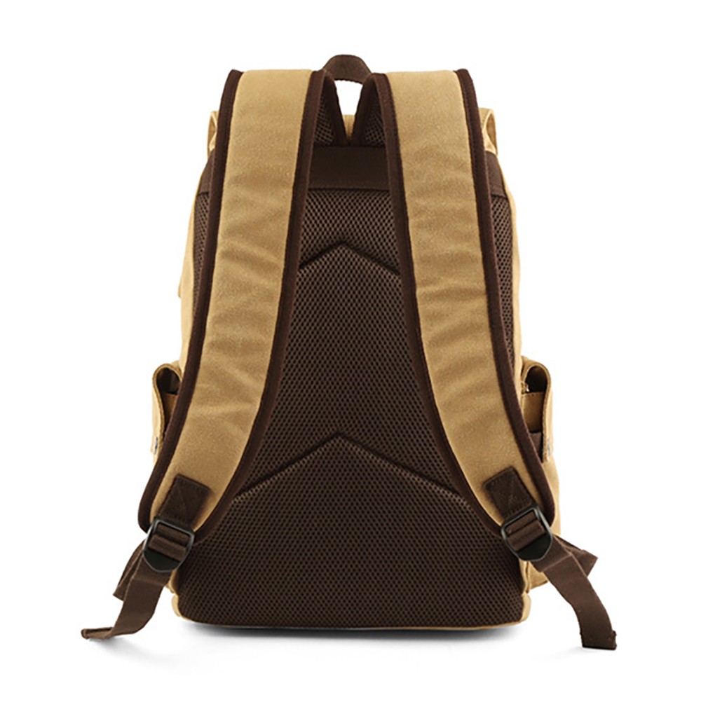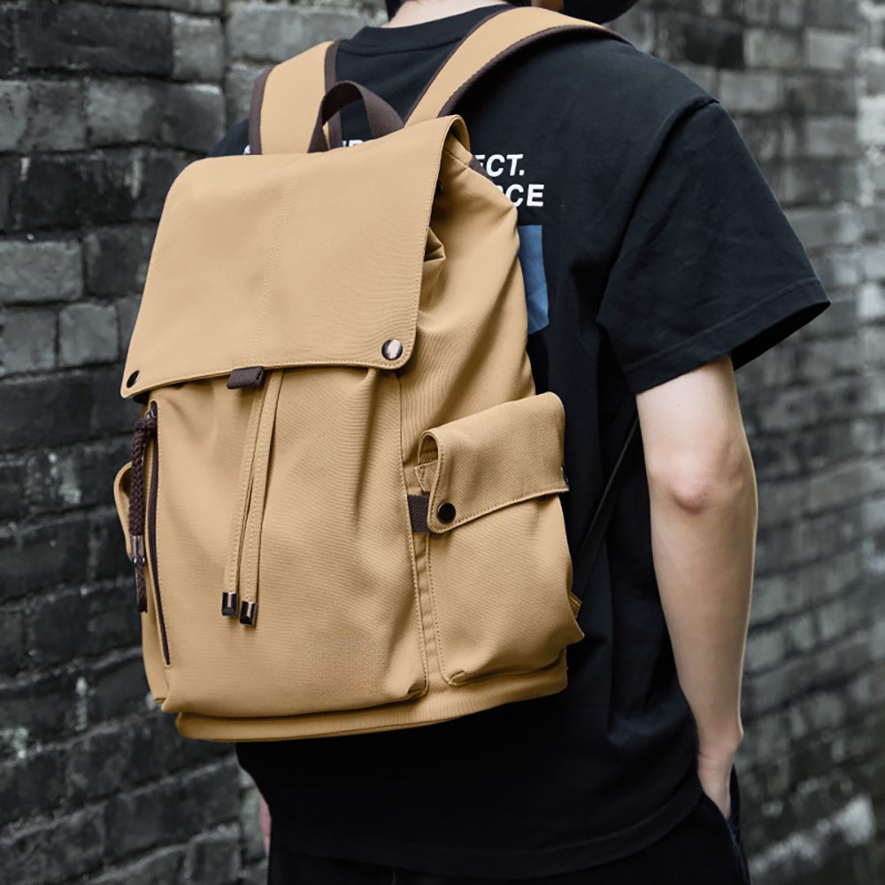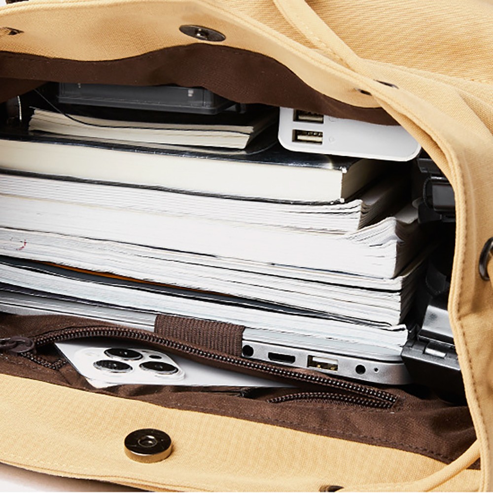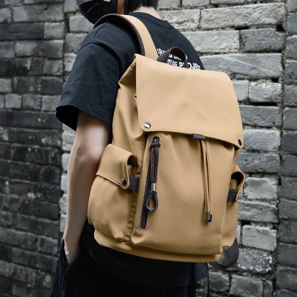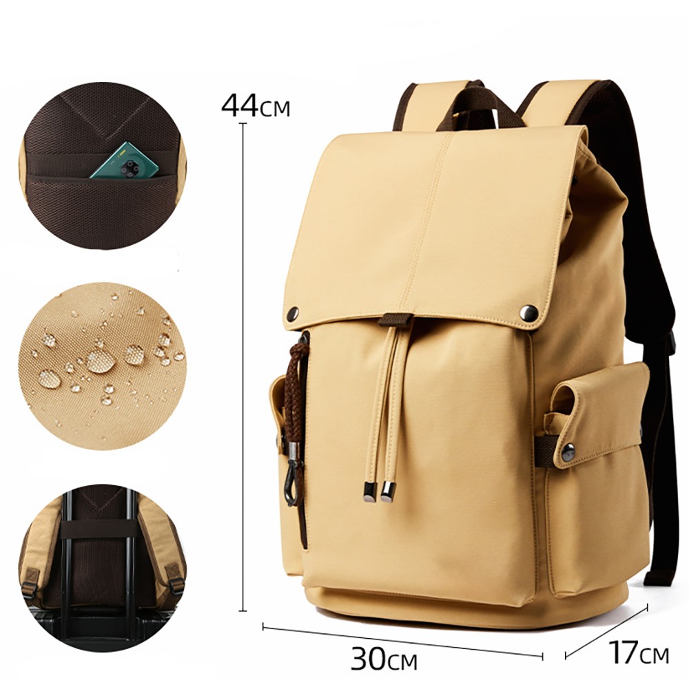The bag is made of high-density waterproof and splash-proof fabric, which is wear-resistant, durable and easy to clean. The surface presents a retro canvas texture, which can effectively cope with complex environments such as rainy days and outdoors, fully protecting electronic devices, documents and other items inside from moisture and scratches. The khaki retro version with metal rivets and drawstring closure combines business texture and literary trend attributes, suitable for commuting, leisure, campus and other wearing styles. With dimensions of 44×30×17cm, it has a moderate capacity suitable for daily commuting and short trips.