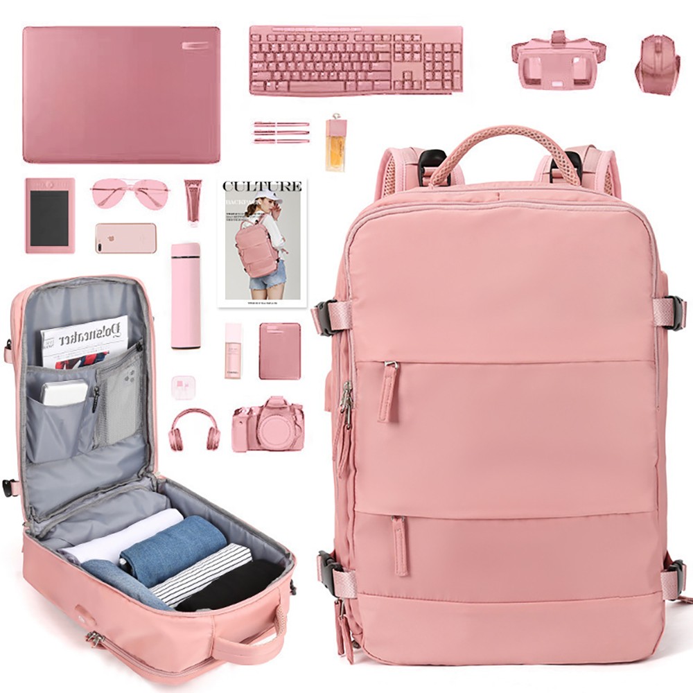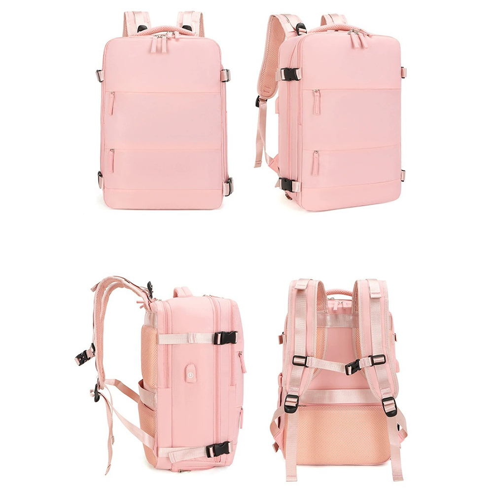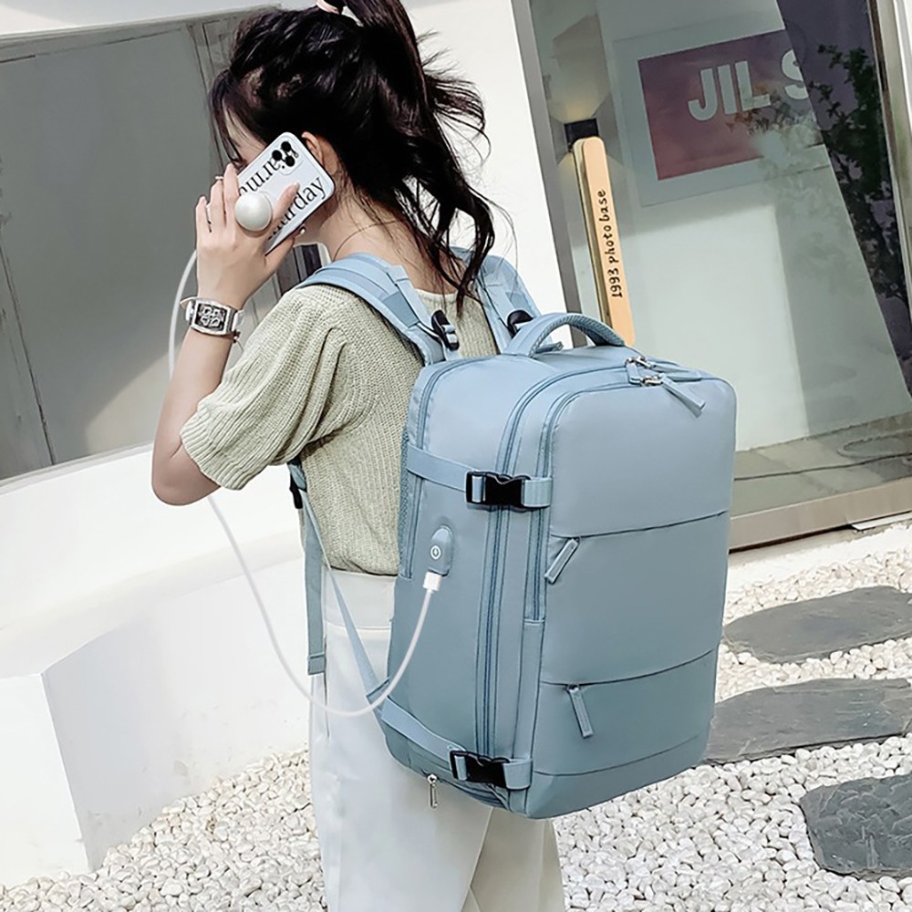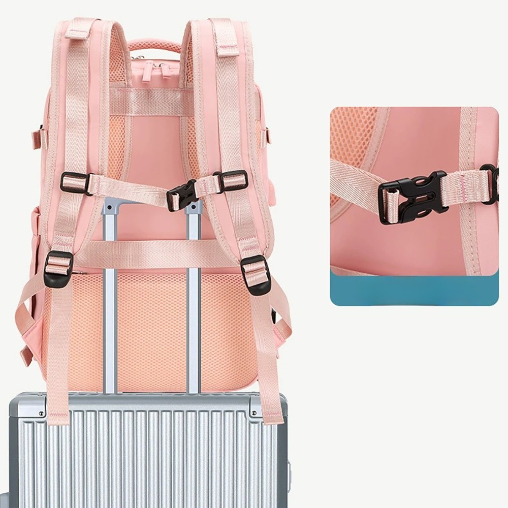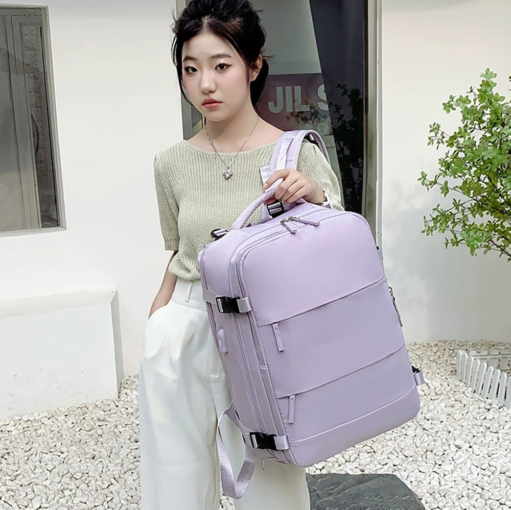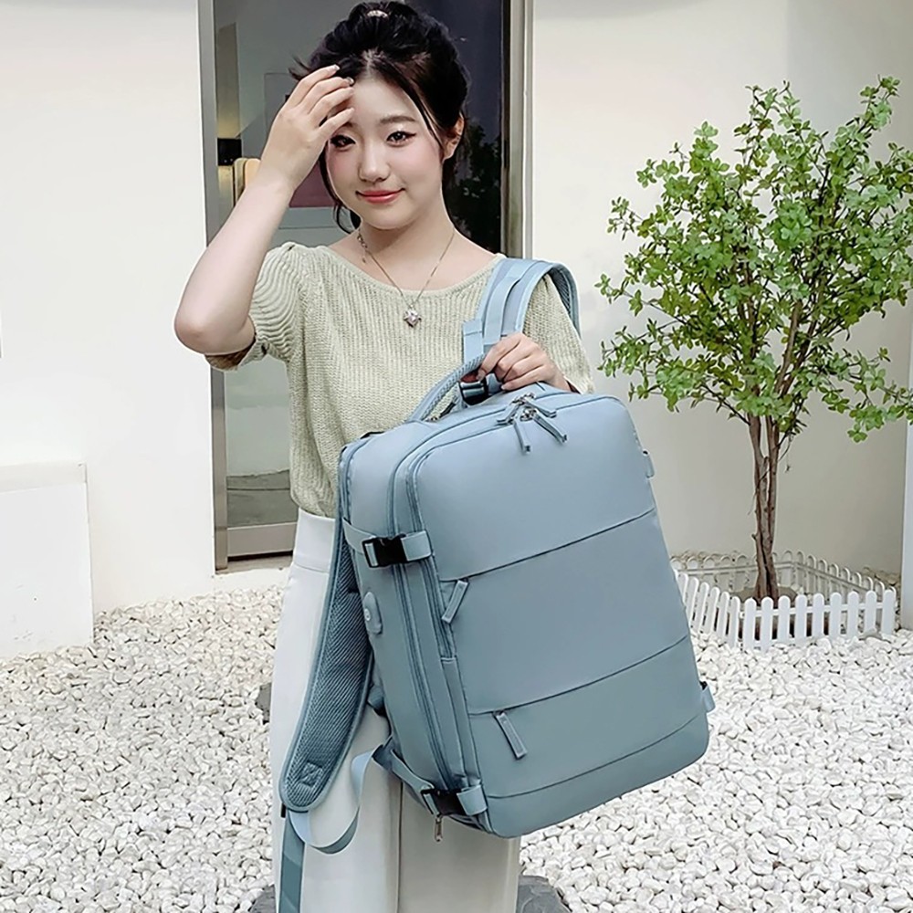 With dimensions of 31×17×42cm, it strictly complies with the carry-on luggage size standards of major global airlines, allowing direct boarding without checking in. Adopting a fully open suitcase-style opening design, the main compartment can flatly store clothes for 3-5 days of short trips, and is equipped with internal mesh pockets for organized storage. The independent shockproof digital compartment can hold a 15.6-inch laptop, tablet and power bank, effectively protecting electronic devices from bumps. The double-zipper front pockets allow quick access to documents, lipstick, earphones and other small personal items. Hidden side pockets are suitable for water bottles and folding umbrellas.It is equipped with an external USB charging port, which can charge your devices on the go by connecting to an internal power bank, solving battery life anxiety during travel. The back features breathable honeycomb mesh shoulder straps and a thickened decompression back panel, paired with adjustable chest and waist buckles to evenly distribute shoulder pressure for comfortable long-term carrying. The exclusive luggage strap on the back can be firmly fixed on the suitcase handle, freeing your hands for easy travel. Adjustable compression buckles on the sides can tighten or expand the backpack volume according to storage needs, adapting to different travel scenarios.