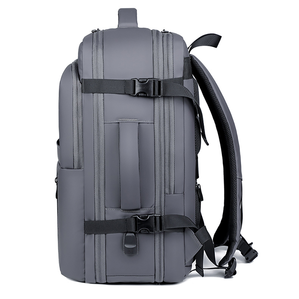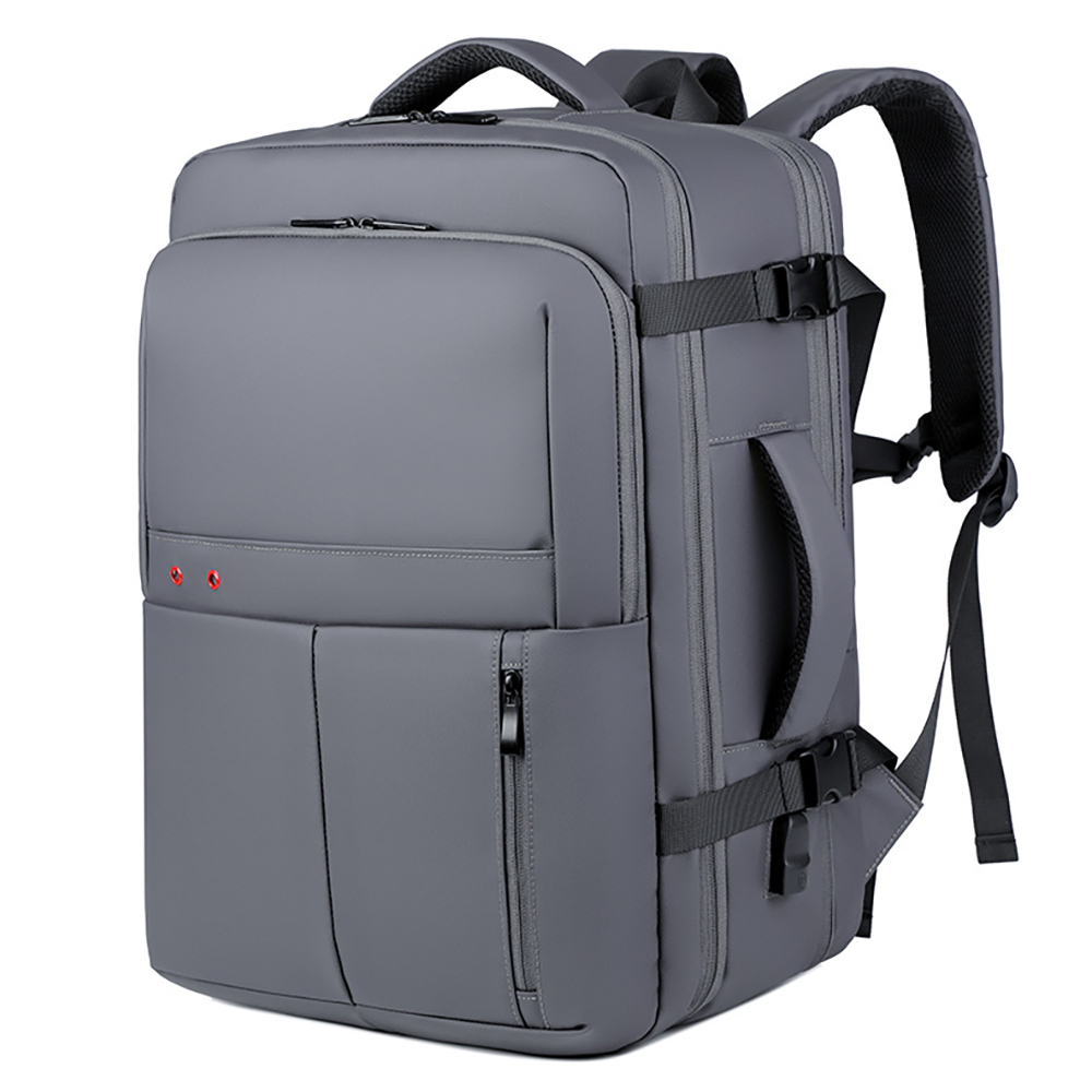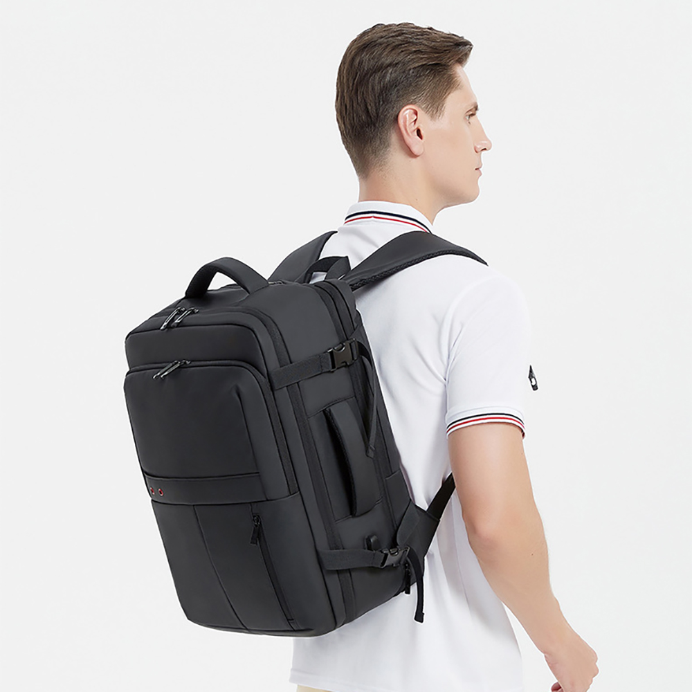 The bag is made of wear-resistant and waterproof high-density splash-proof fabric, which is tear-resistant and easy to clean, can effectively cope with complex travel environments such as rainy days, and protect internal items from moisture. The main compartment supports expandable design, which can flexibly expand the space according to travel needs, easily storing 17.3-inch laptops, clothes, documents and other items. The interior adopts a multi-compartment partition design, with an independent thickened shockproof computer compartment paired with an elastic fixing strap, which can stably protect electronic devices. It is equipped with multi-specification pockets such as pen holders, card slots, mesh pockets and tablet storage areas, which can orderly store umbrellas, power banks, documents, stationery and other personal items. The independent front zipper pocket allows quick access to mobile phones, keys and other small items, and the side pockets are suitable for water cups and folding umbrellas.The bag is equipped with an external USB charging port, which can charge your devices on the go by connecting to an internal power bank, completely solving the battery life anxiety during travel. The front is designed with ventilation holes to discharge moisture in the bag and keep items dry. The back adopts an ergonomic breathable decompression design, with thickened honeycomb mesh shoulder straps, chest buckles and a decompression back panel, which can disperse shoulder pressure, without stuffiness or shoulder pressure even when worn for a long time. The exclusive luggage fixing strap on the back can firmly fix the backpack on the suitcase handle, freeing your hands for easy travel. The reinforced top handle supports both hand-held and shoulder-back carrying methods, with flexible switching.