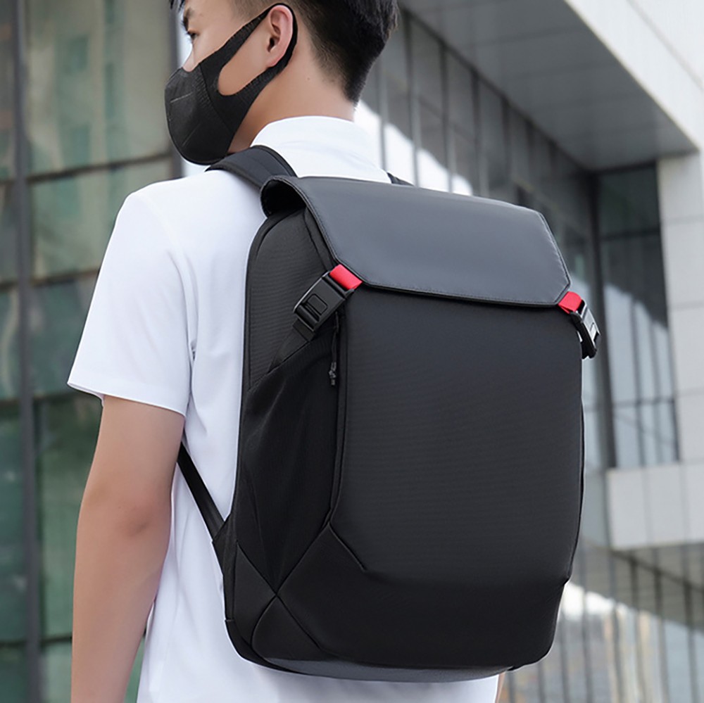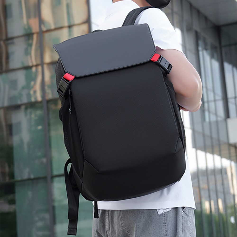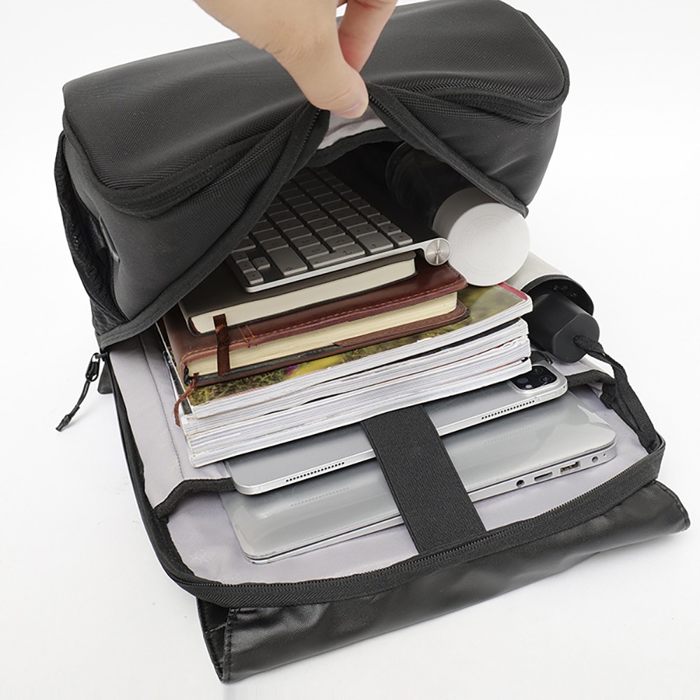 The main body of the bag is made of high-elasticity wear-resistant waterproof nylon cloth and matte PU spliced material, which has excellent tear and scratch resistance, waterproof and easy to clean. It can easily cope with complex environments such as rainy days and commuting dust, protecting internal items from moisture. The main compartment is spacious, and the interior adopts a multi-layer partition storage design. It is equipped with a thickened shockproof computer compartment that can stably hold a 15.6-inch laptop. Paired with an elastic fixing strap, it prevents device shaking and effectively buffers collisions; it is equipped with multi-specification pockets, including a file pocket, pen holder, card slot, tablet storage area and hidden pocket. It can orderly store keyboards, books, notebooks, power banks, documents and other personal items, making storage more organized and efficient.The outside of the bag is equipped with an external USB charging port, which can charge devices on the go by connecting to a power bank stored inside, completely solving the battery life anxiety during travel. The cover is equipped with red buckle lock designs on both sides, which can close the flip cover to prevent items from falling and increase anti-theft attributes. Elastic mesh pockets on the sides can flexibly hold water cups, folding umbrellas and other items. The back adopts an ergonomic decompression 背负 system, with a three-dimensional breathable sponge back panel and thickened widened shoulder straps, which can effectively disperse shoulder and back pressure, without stuffiness or shoulder pressure even when worn for a long time; the reinforced top handle supports both hand-held and shoulder-back carrying methods, with flexible switching.