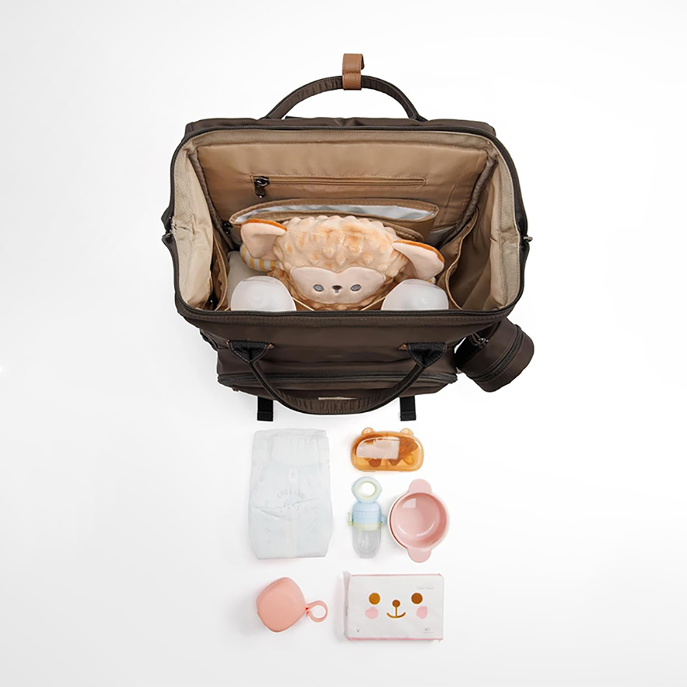 Main Compartment: Features a wide opening with multiple internal pockets to easily organize milk powder cans, baby clothes, and toys.